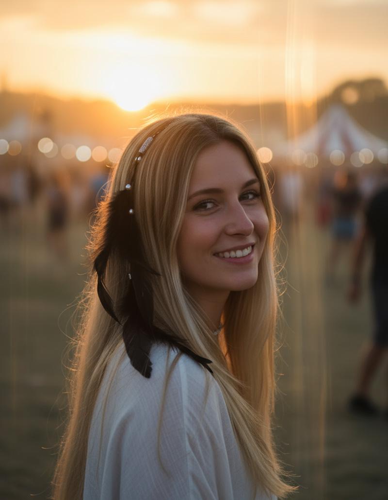 Bevor Mira das Festivalgelände betrat, setzte sie die Haarspange sorgfältig in ihr lockeres, sonnenverwöhntes Haar und richtete die Federn so aus, dass sie bei jedem Schritt tänzelten und tanzten. Sie fühlte sich vollkommen, als wäre dieser eine kleine Schmuckstück der letzte Schlüssel zu ihrem idealen Festival-Look.