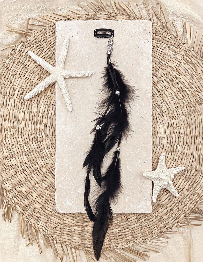 Unsere Boho Hair Dream Haarspange komplettiert Dein Festival Outfit mit ihrem hellbraunem Band, schwarzen Federn und silbernen Perlen, perfektionierst Du Deinen Festival Look.