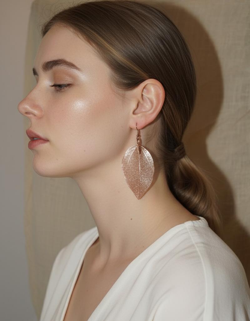 Am Tag des Festes setzte Sophie die Leaf Love Rose Ohrringe an und betrachtete sich im Spiegel. Die filigranen Blätter funkelten sanft im Licht und brachten ihre natürliche Schönheit zum Strahlen. Sie fühlte sich mit der Natur verbunden und bereit, den Tag mit Eleganz und Freude zu genießen.