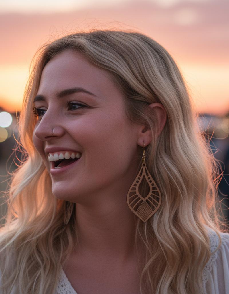 Am Morgen eines sonnigen Tages setzte Mira die Wooden Dream Ohrringe an und betrachtete sich im Spiegel. Die kunstvollen Ornamente funkelten sanft im Licht und brachten ihre natürliche Schönheit zum Strahlen. Sie fühlte sich mit der Natur verbunden und bereit, den Tag mit Leichtigkeit und Anmut zu meistern.